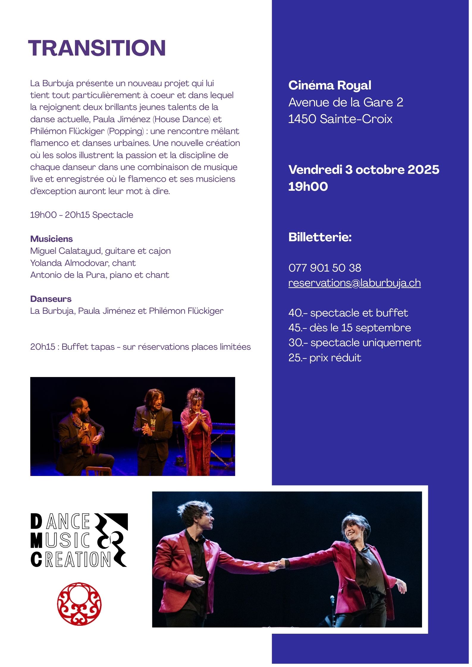 Danses : Michelle Gagnaux « la Burbuja »Paula Jimenez et Philémon FlückigerGuitare et cajon : Miguel CalatayudChant : Yolanda AlmodovarPiano et chant : Antonio de la Pura